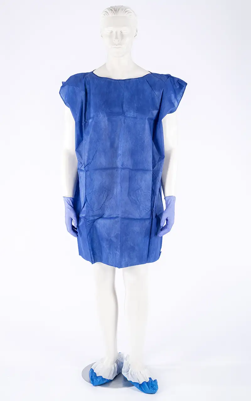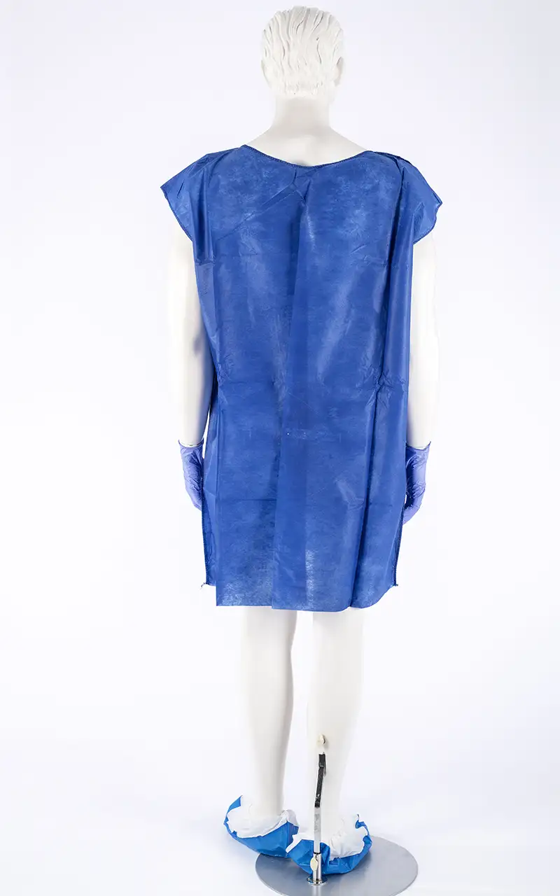 Disposable gown to cover the user's body like pajamas. Made of three-layer non-woven polypropylene (PP) fabric, dark blue and opaque to avoid uncomfortable transparency; soft and breathable, ensuring comfort against the skin.
