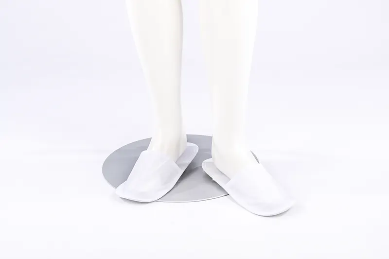Disposable indoor slippers. Made of white, non-woven Polypropylene (PP) fabric with a semi-rigid sole. Available with an open or closed toe and in various sizes.