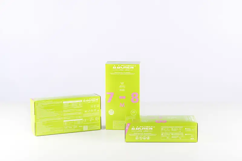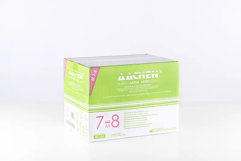 Non-sterile, powder-free, ambidextrous latex glove, AACHEN brand.