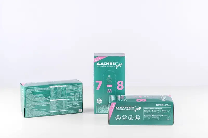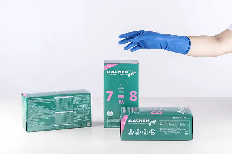 AACHENGRIP brand blue powder-free, non-sterile latex gloves.