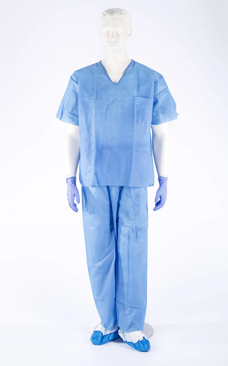 Two-piece set consisting of disposable top and trousers, made of sky blue SMS non-woven fabric. Water-repellent and breathable, latex-free.