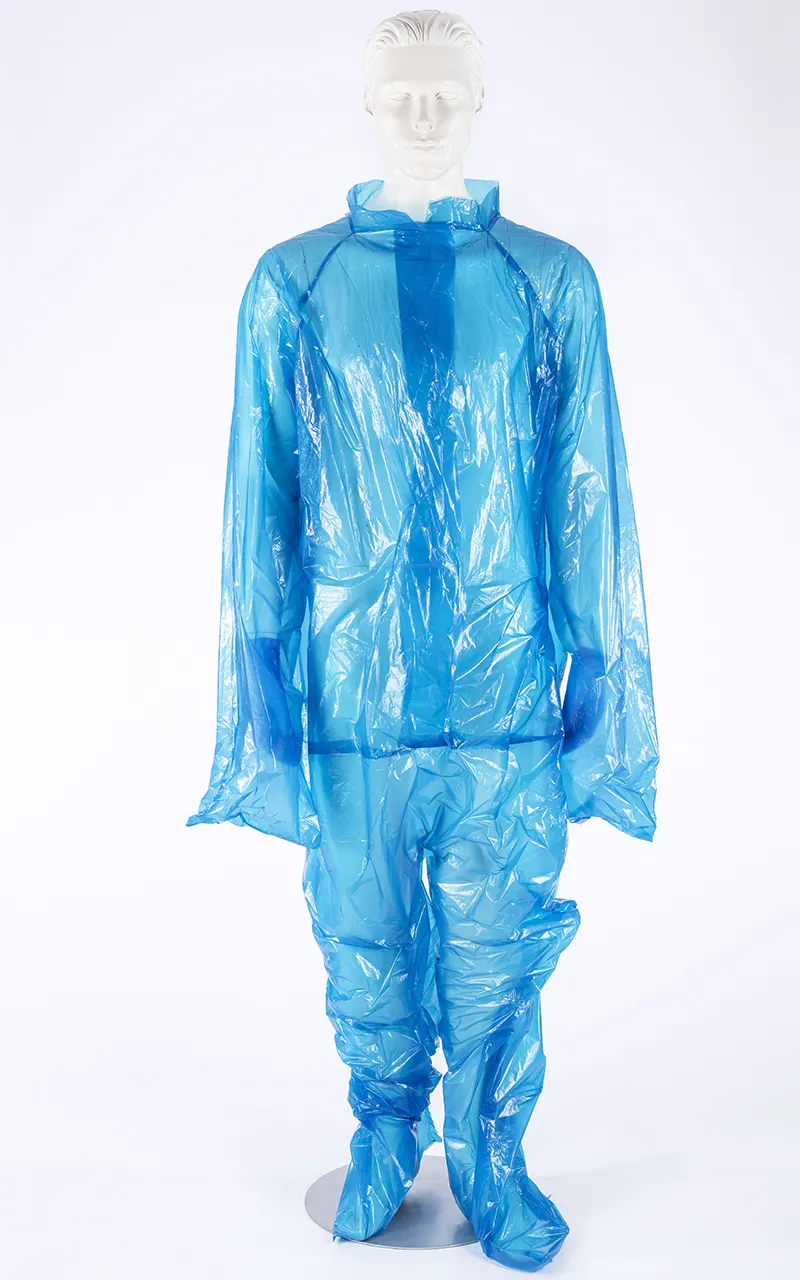 Disposable sweat coverall, made of low-density polyethylene (LDPE), blue in color. Features a three-point hook-and-loop closure and is secured at the wrists and ankles. No hood.
