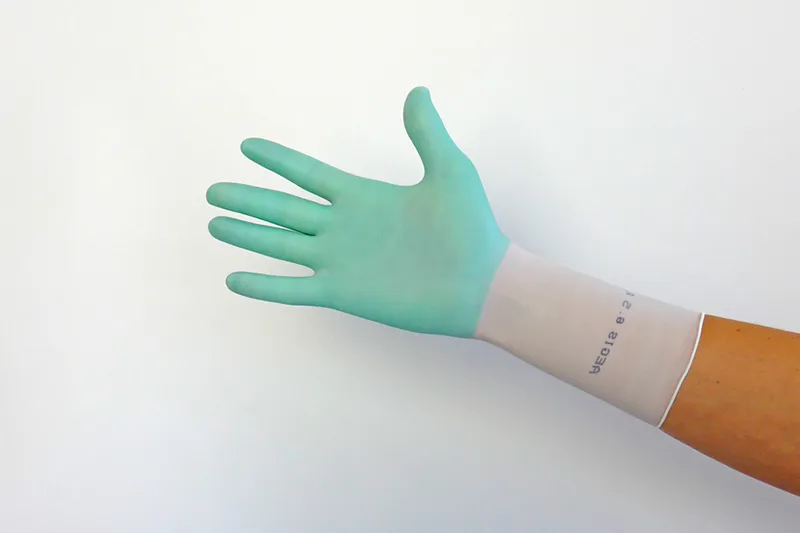 Finessis Aegis synthetic surgical gloves for viral protection. Three-layer "sandwich" construction with two layers (inner and outer) of Flexylon elastomer and an intermediate layer containing a disinfectant liquid that activates in case of puncture. The material is manufactured using molecular layering technology, an innovative and patented polymer production technique that results in a product with excellent elasticity, comfort, and resistance. The proactive disinfection system works as follows: